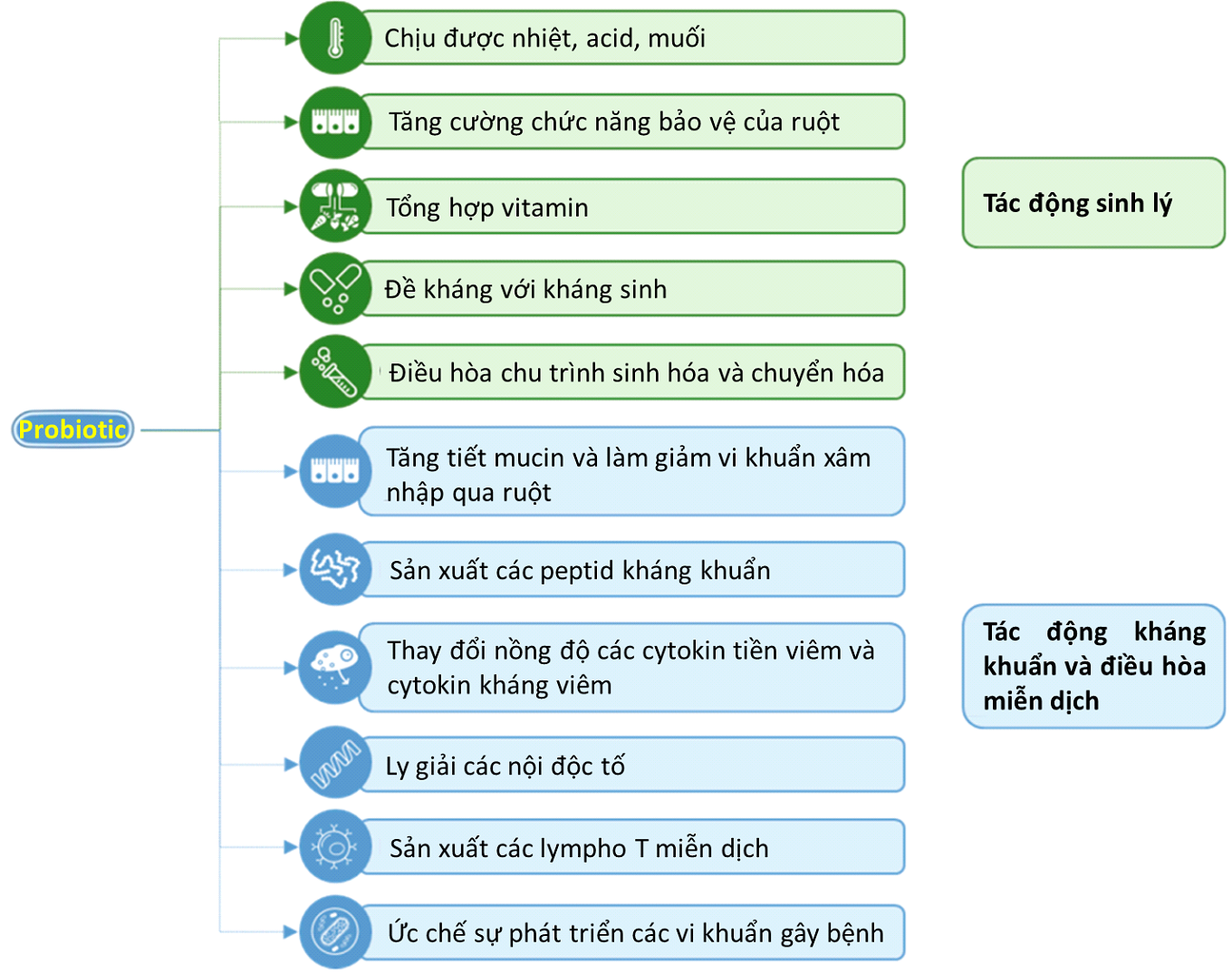 Probiotic đã được nghiên cứu trên nhiều tác động khác nhau và cho thấy lợi ích trên chức năng sinh lý và miễn dịch. Những lợi ích của “Probiotic” được minh họa trong hình 3.