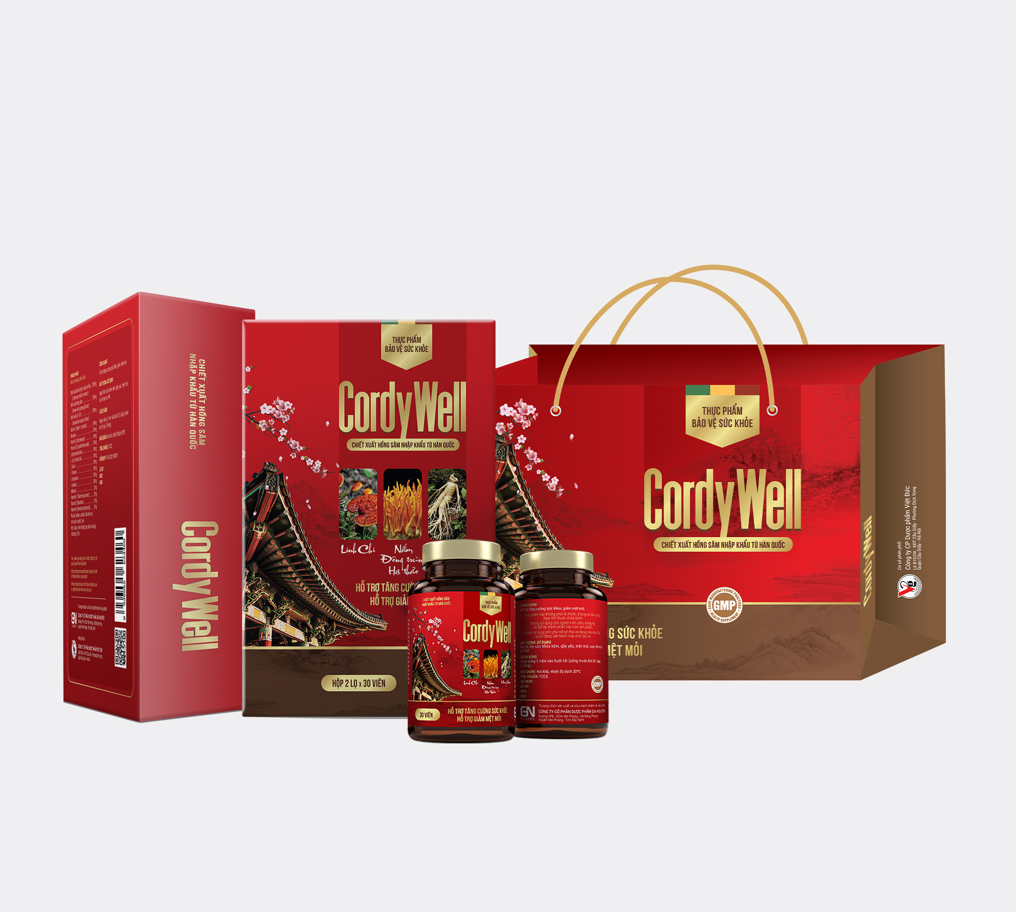 Thực phẩm bảo vệ sức khỏe CordyWell với thành phần chính là chiết xuất hồng sâm Hàn Quốc, đông trùng hạ thảo, nấm linh chi giúp hỗ trợ tăng cường sức khỏe, giảm mệt mỏi